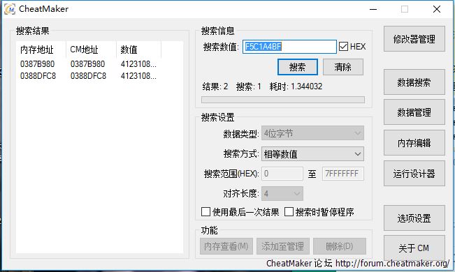 如果正确的话搜索F5C1A4BF得到的第一个地址0387b980,数值应该是4123108543