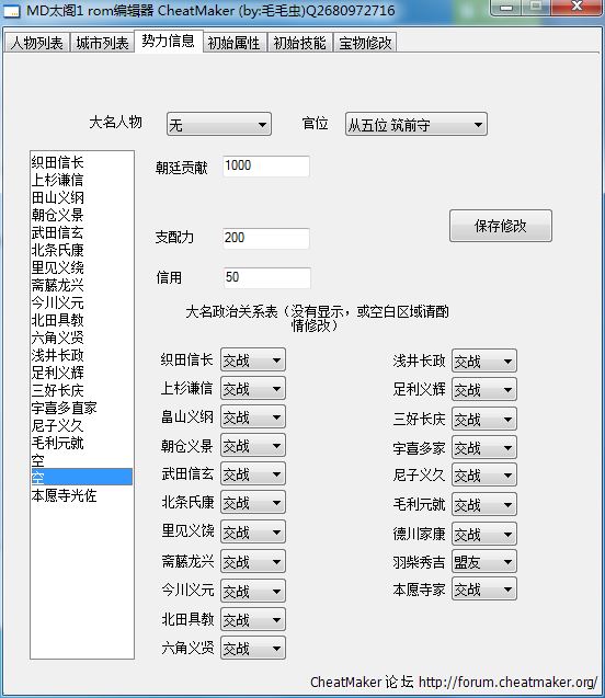 9.增加大名势力关系修改,贡献度修改10.初始属性,和技能修改