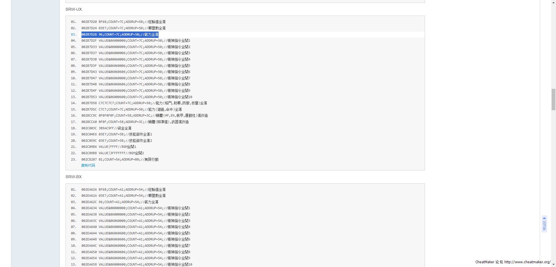 - 021F0DE0 1403;COUNT=79;ADDRUP=40;//機體(交代),武器滿改造
