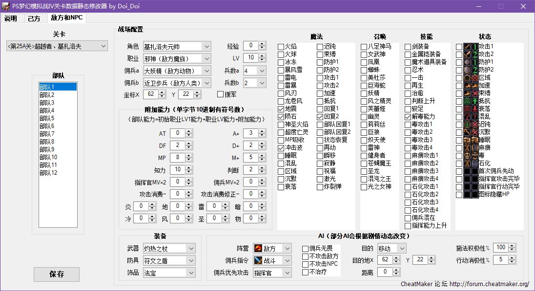 本修改器能修改PS梦幻模拟战Ⅳ己方登场和转职表、全职业、全佣兵、全召唤物、全道具、全关卡商店和敌方配置等数据。