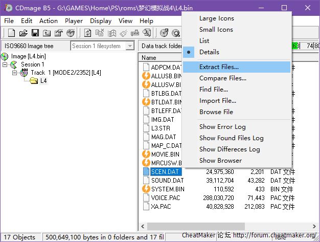 运行CDmage.exe→Open打开bin格式L4镜像(非只读)→选择M2/2352类型打开→左侧点击Track 1下的L4→右侧指向"SCEN.DAT"右键菜单点击Extract Files→选择修改器目录并导出。