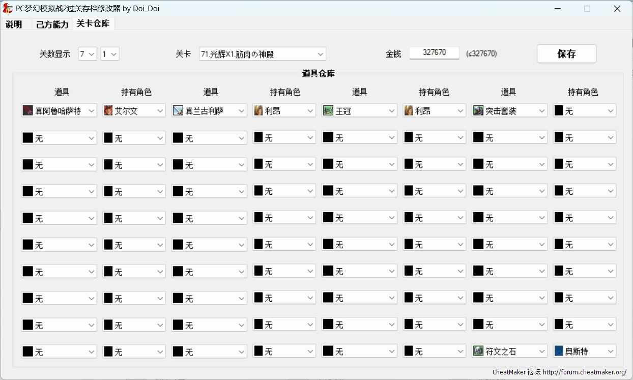 本修改器能修改己方能力、关数、金钱、道具仓库。