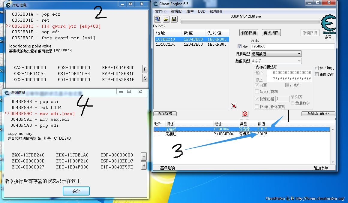 (一)无法找到基质,按照逐步搜索是什么访问指针地址的思想最后会发现是1cfbe240这个地址自己访问了自己,而且也搜索不到包含1cfbe240的地址                      找基址失败       (二)尝试用人造指针也失败   我仿造ce第七课人造指针的课程自己写了一个脚本 但是一运行游戏就崩溃。