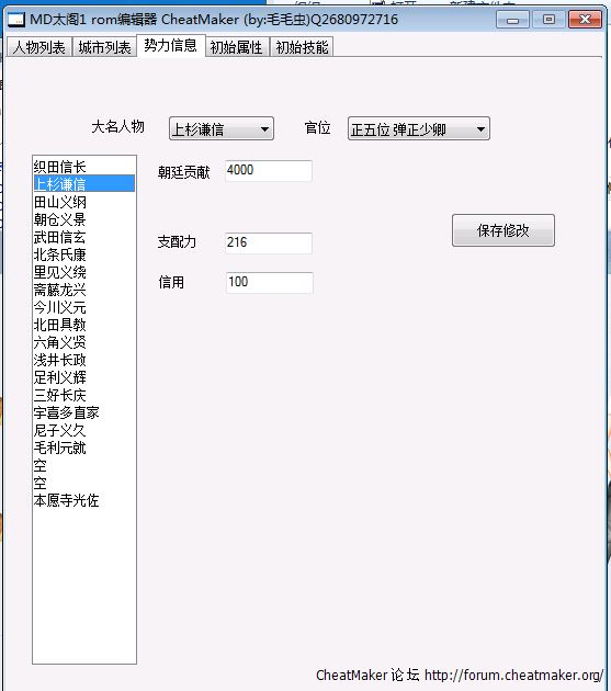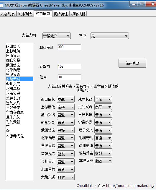 9.增加大名势力关系修改,贡献度修改10.初始属性,和技能修改