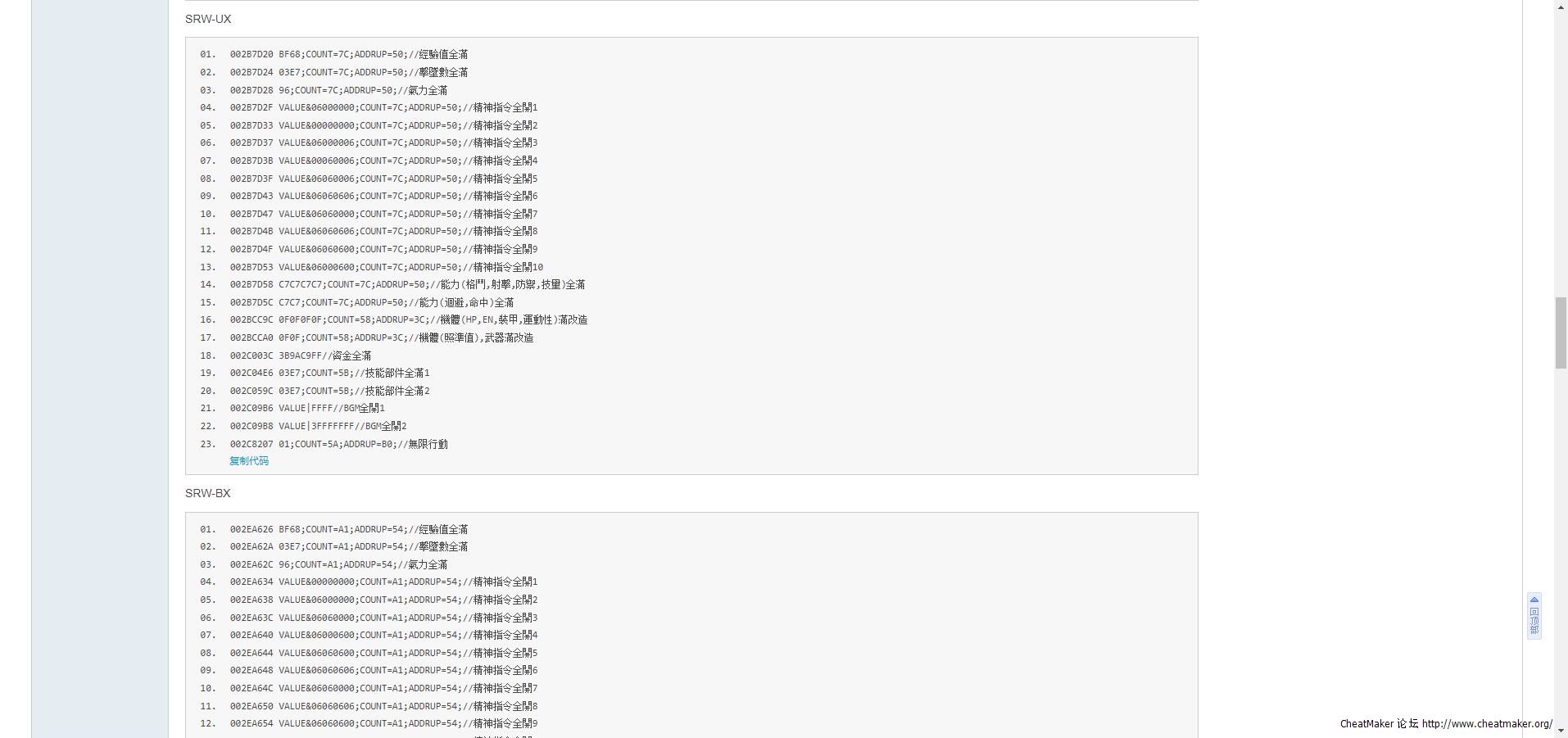 复制代码SRW-UX - 002B7D20 BF68;COUNT=7C;ADDRUP=50;//經驗值全滿