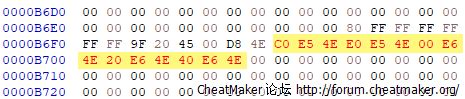 C0 E5 4E E0 E5 4E 00 E6 4E 20 E6 4E 40 E6 4E复制然后到HxD那个0000字节开头,ctrl + B 覆盖粘贴上去,然后保存进入游戏查看。