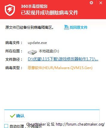 今天在用CM修改器时360提示升级程序“update.exe”程序有病毒,并自动删除了,导致CM有些功能不能用,想确认一下“update.exe”是不是安全的