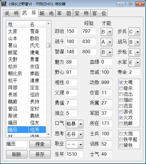 http://天翔記.jp/?page=nobu_mod_the_tools_savedat不過就是找不到適合HD本身用的。銀河漫步可否考慮做一個?如可以, 這個版本最好可加上改變武將本身的狀況設定, 如隱居, 死亡, 現役, 公主等。